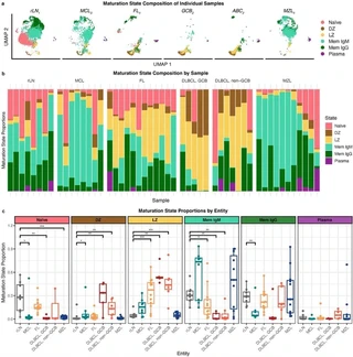 Through highly multiplexed immunohistochemistry (CODEX) of samples from 19 of these patients, we found that intratumor maturation states inhabited distinct spatial niches, displaying cellular interactions and regulatory networks typical of their maturation states while harboring different genetic variants. By deconvoluting intratumor maturation states from a microarray dataset of 507 patients, we identified risk groups within diagnoses with striking differences in survival, including IgM memory-enriched germinal center B-cell (M = 1.9 vs >10 years, p = 0.00039) and activated B-cell (M = 2.4 vs 9.6 years, p = 0.016) diffuse large B-cell lymphoma, and dark zone-enriched follicular lymphoma (M = 8.6 vs 13 years; p = 0.0019). Our findings reveal cellular differentiation remains plastic in B-cell lymphomas, driving tumor variation, evolution, and response.