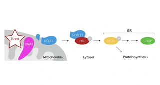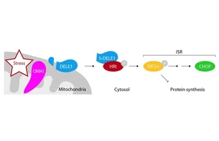 Here we combine genome engineering and haploid genetics to unbiasedly identify genes that affect the induction of C/EBP homologous protein (CHOP), a key factor in the integrated stress response. We show that the mitochondrial protease OMA1 and the poorly characterized protein DELE1, together with HRI, constitute the missing pathway that is triggered by mitochondrial stress. Mechanistically, stress-induced activation of OMA1 causes DELE1 to be cleaved into a short form that accumulates in the cytosol, where it binds to and activates HRI via its C-terminal portion. Obstruction of this pathway can be beneficial or adverse depending on the type of mitochondrial perturbation. In addition to the core pathway components, our comparative genetic screening strategy identifies a suite of additional regulators. Together, these findings could be used to inform future strategies to modulate the cellular response to mitochondrial dysfunction in the context of human disease.
